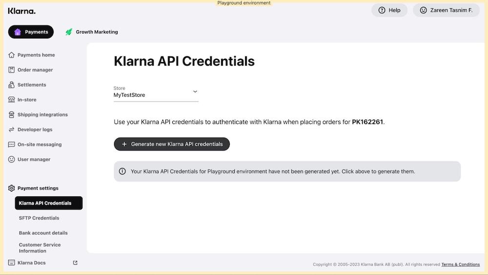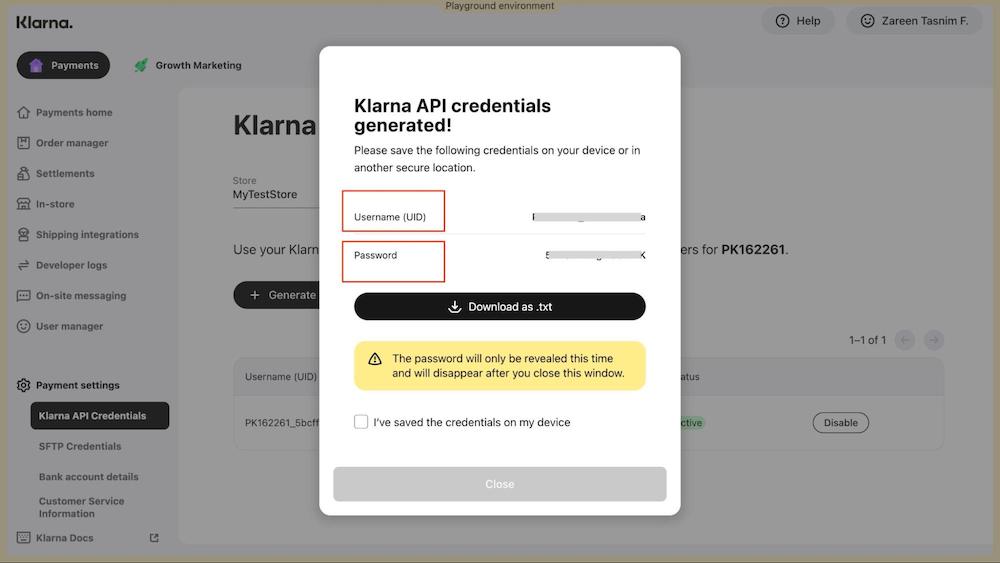 Enter your Klarna-generated username and password obtained from the Klarna dashboard. You can obtain them by following these steps: