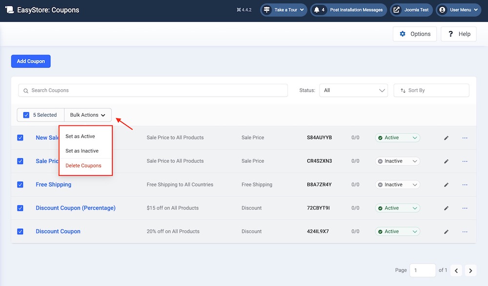 Delete Coupon: Select this option to delete the chosen coupons. Once deleted, they cannot be restored, and customers will no longer be able to use them in your store.