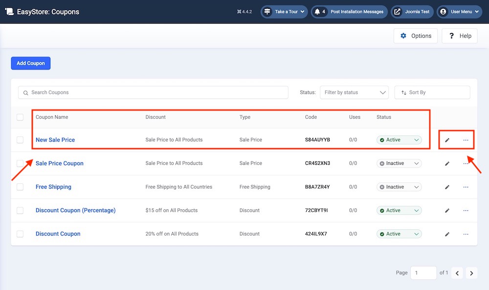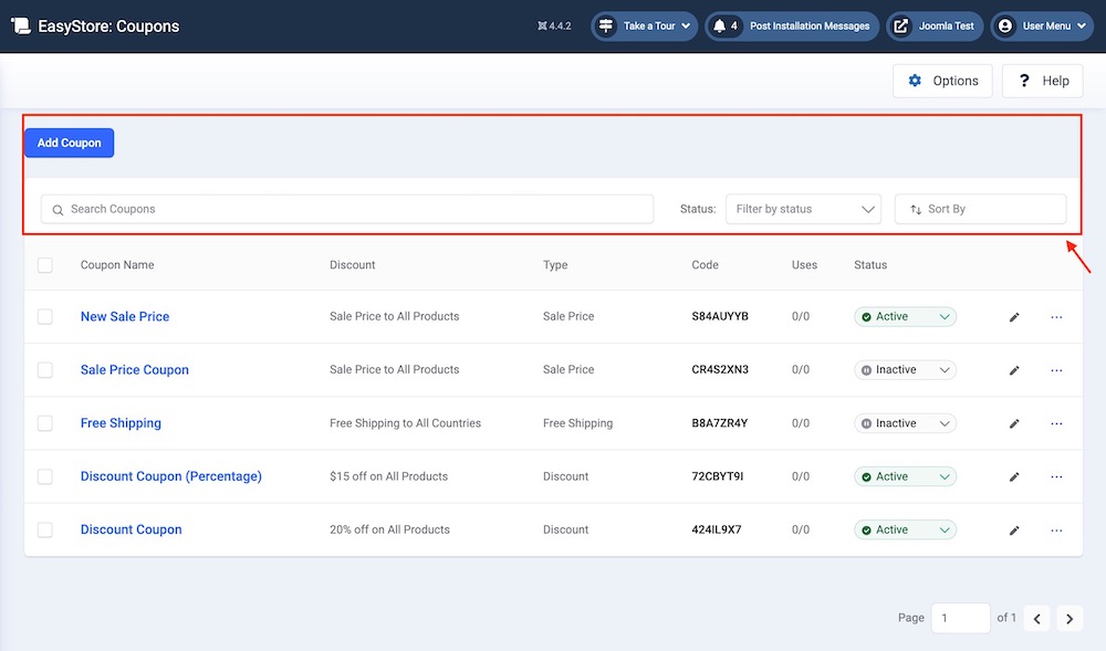 Status: Sort coupons based on their current status: Active or Inactive. This helps quickly locate and manage items based on their status.