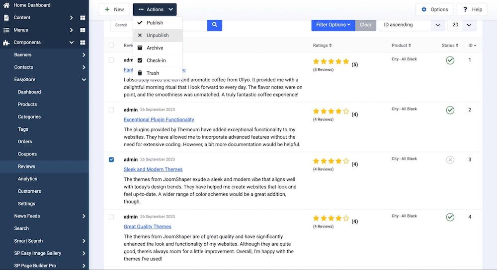 To access customer reviews, go to Joomla Dashboard > Components > EasyStore > Reviews.