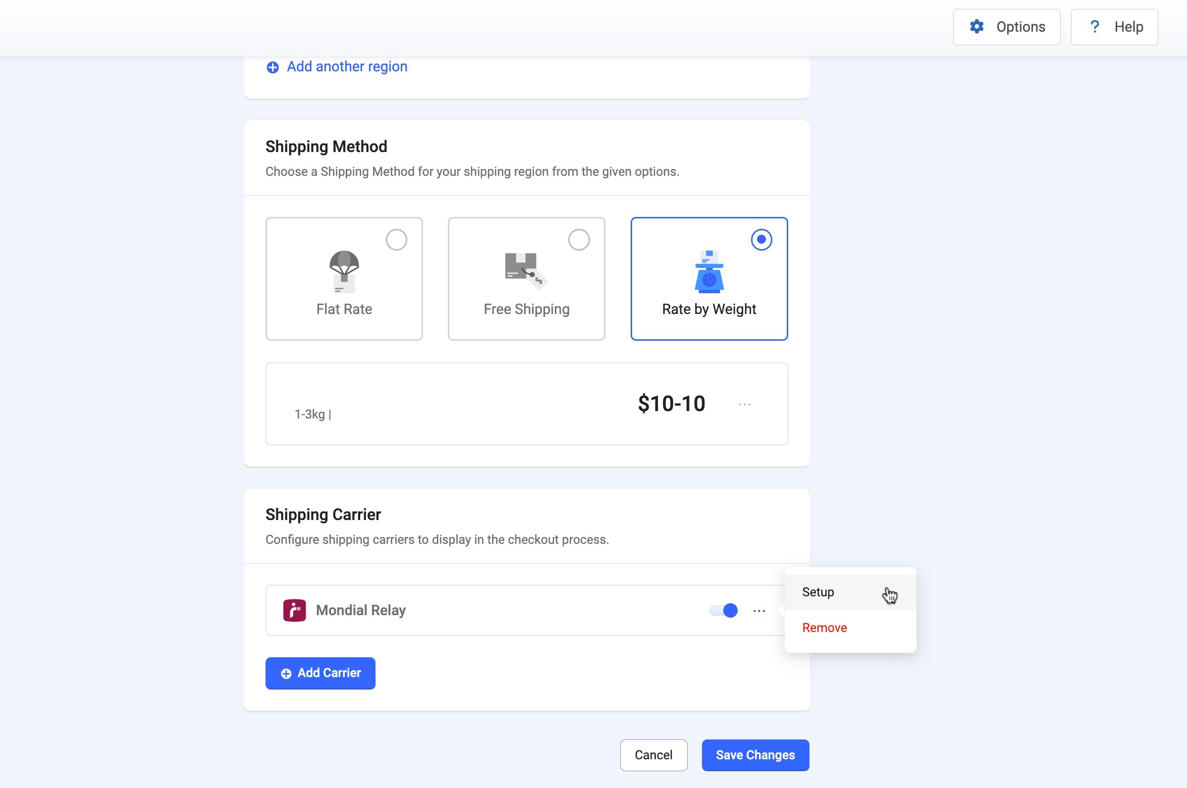 After adding Mondial Relay as your preferred shipping carrier, locate it in the list and click the "Setup" button next to it.
