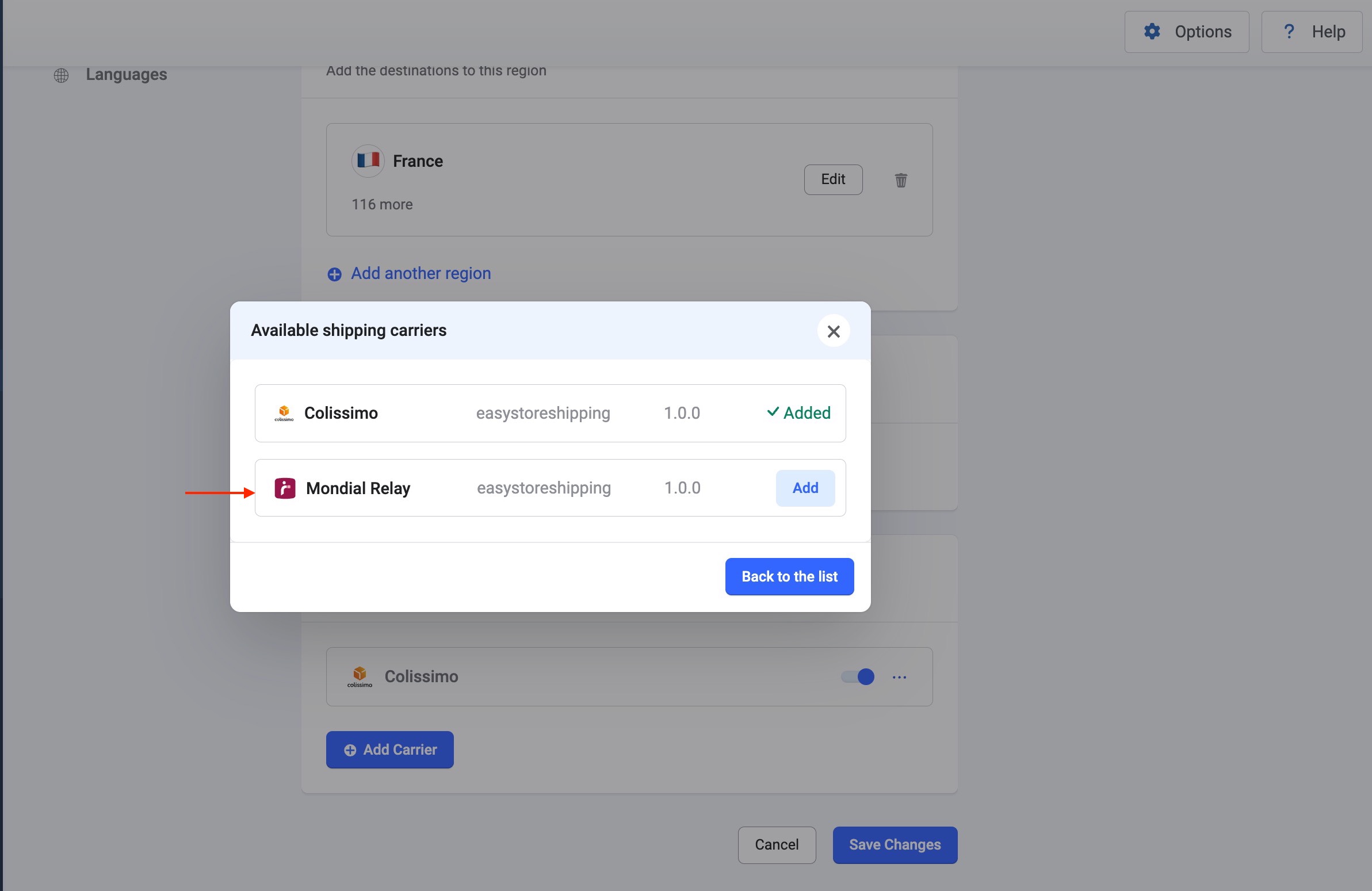 Click the "Back to the list" button once you are done. Mondial Relay will now be added to your store’s available shipping options.