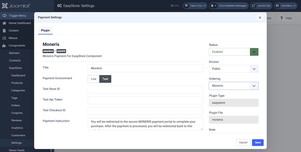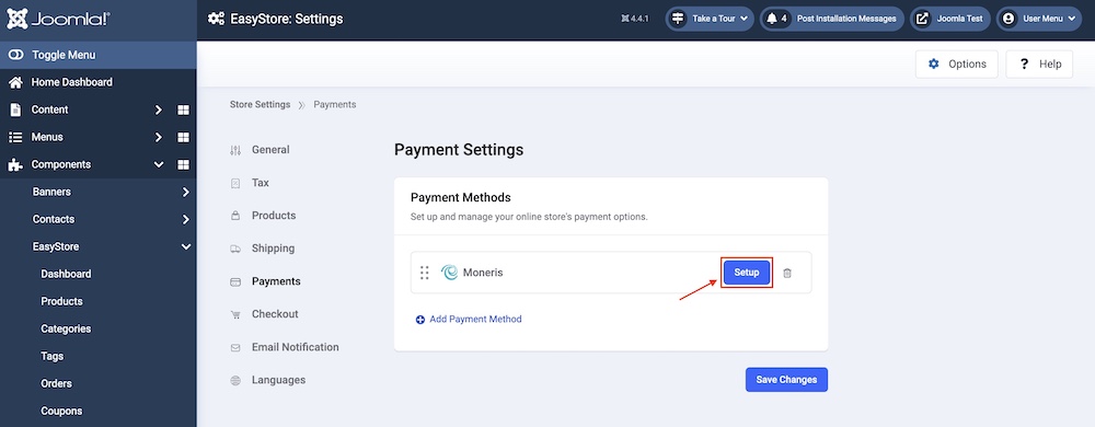 Log in to your Joomla Dashboard and navigate to Components > EasyStore > Settings > Payments.