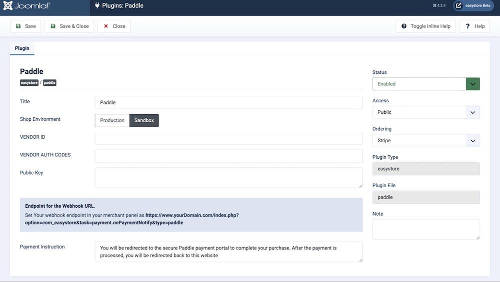 After entering the requisite information, click the "Save" or "Save & Close" button to preserve your Paddle integration settings. Your online store can now efficiently process payments via Paddle, presenting a secure and user-friendly payment method for your valued customers.