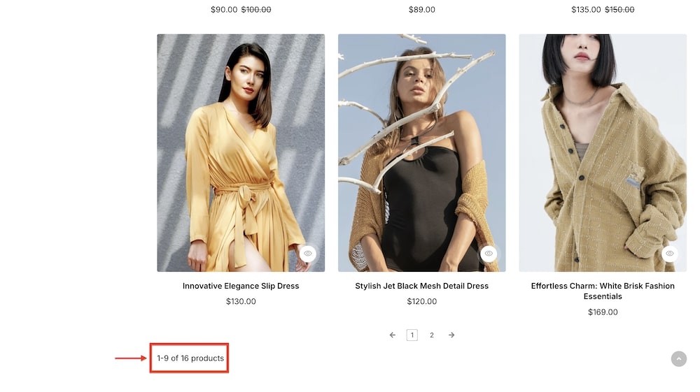 Custom: You can also create a custom pattern for pagination. For example, you can set a pattern that says “Displaying {{R}} of {{T}} products”, where {{R}} indicates the range of products and {{T}} indicates the total amount of products.