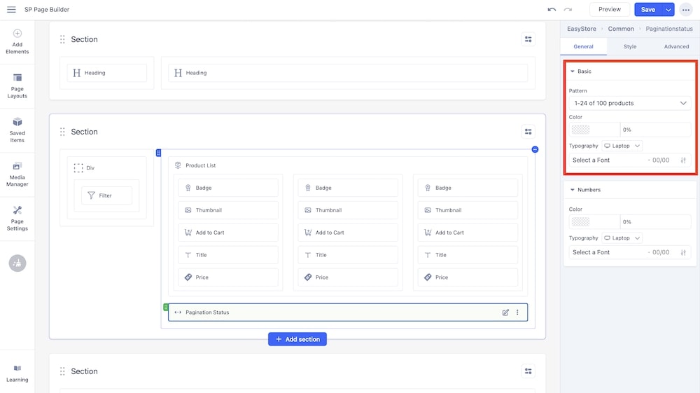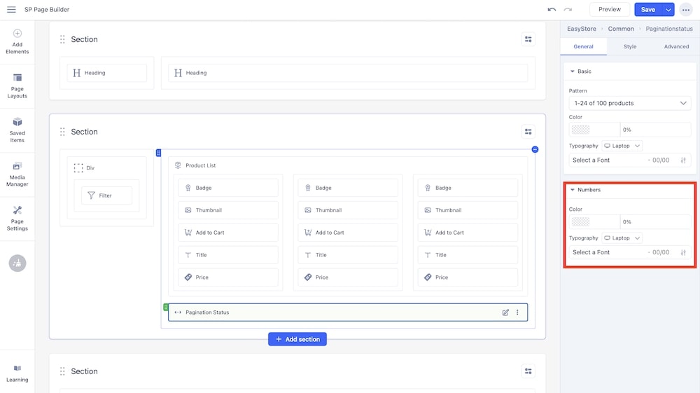 Typography: You can customize the font type, font size, Line Height, Letter Space, Style, and Weight of the pagination status numbers. You can choose the screen type, and set different font settings for each screen type (Laptop, Tablet Landscape, Tablet Portrait, Mobile Landscape, and Mobile Portrait).