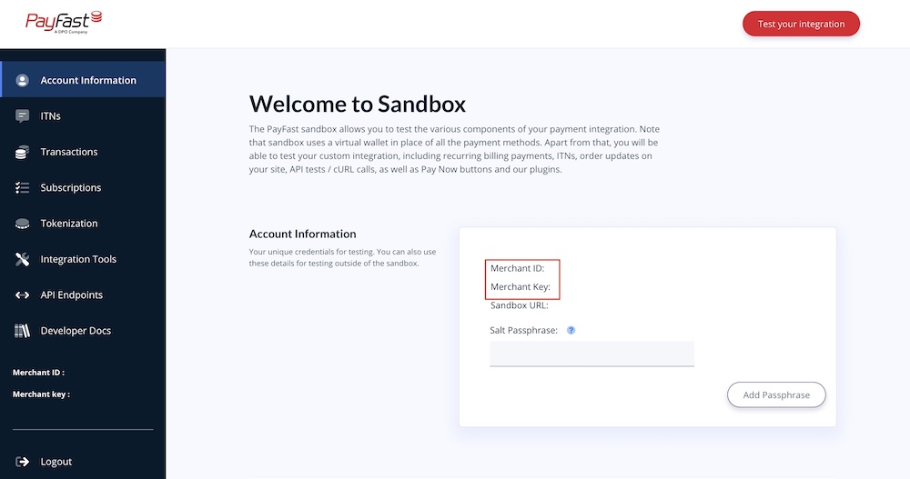Visit https://sandbox.Payfast.co.za/, enter your email address, and hit Proceed. This will take you to the Payfast Sandbox dashboard where you can find your Test Merchant ID and Merchant Key.