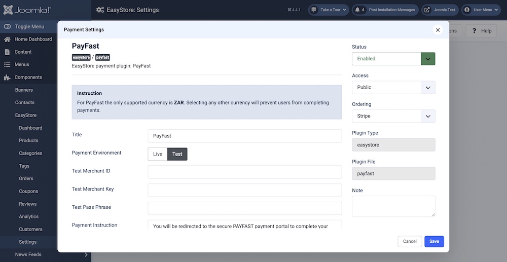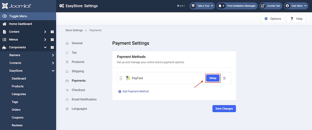 Log in to your Joomla Dashboard and navigate to Components > EasyStore > Settings > Payments.