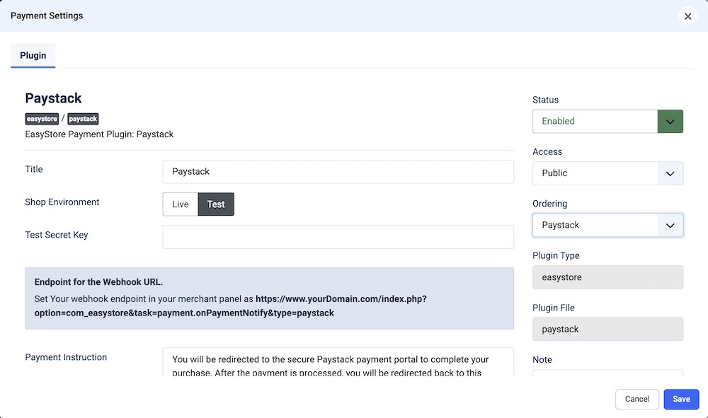 To make the Paystack payment method available for your online store, you need to add it to your list of payment methods from EasyStore > Settings > Payments. Learn more.