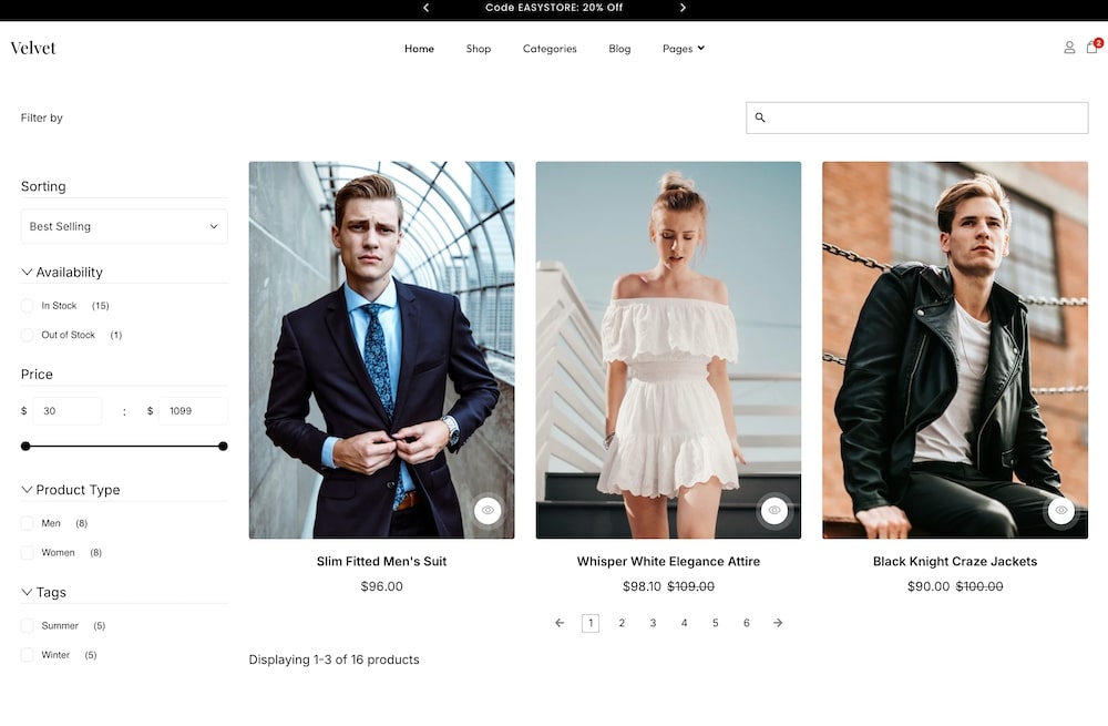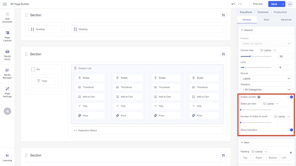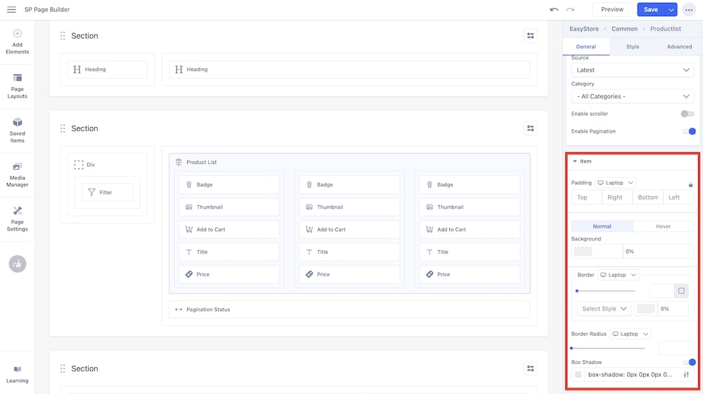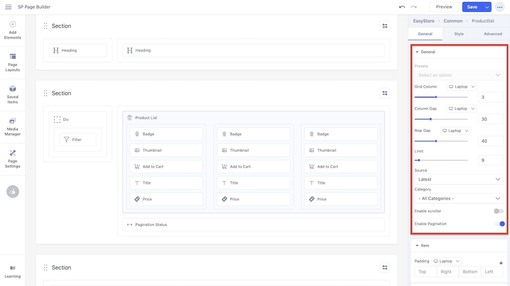 The Product List addon is designed to showcase a collection of products in an organized and visually appealing format within your EasyStore pages. You can adjust the grid layout, set row and column gaps, limit the number of displayed products, choose between pagination or slider formats, and customize each item individually. This addon is essential for eCommerce shops, as it provides flexibility in presenting products, improves browsing efficiency, and enhances the overall shopping experience.