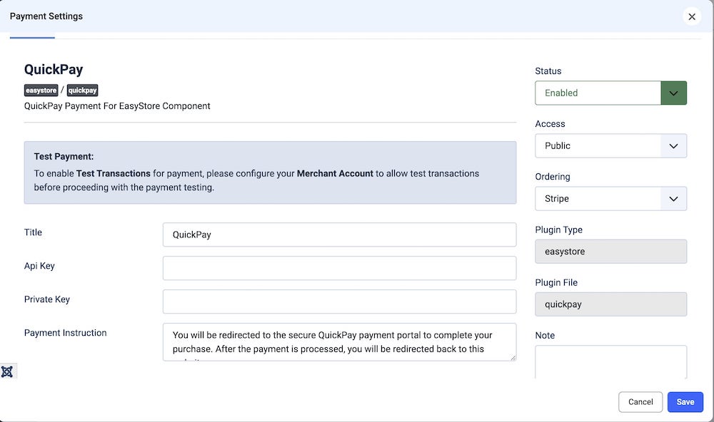 Give your QuickPay integration a title (e.g., "QuickPay"). This user-defined title helps you identify this integration within your Joomla Dashboard.