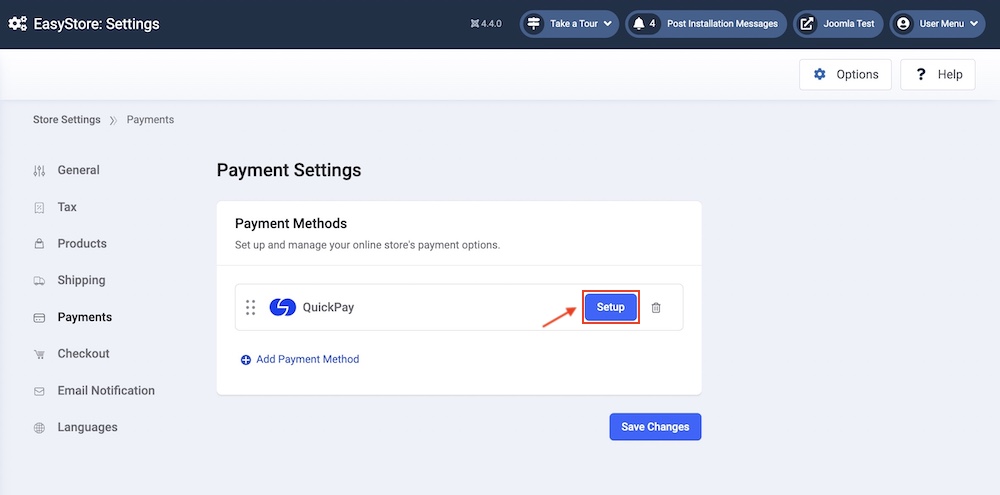 Once you have added QuickPay to your payment method list, click on the "Setup" button beside the QuickPay payment method.