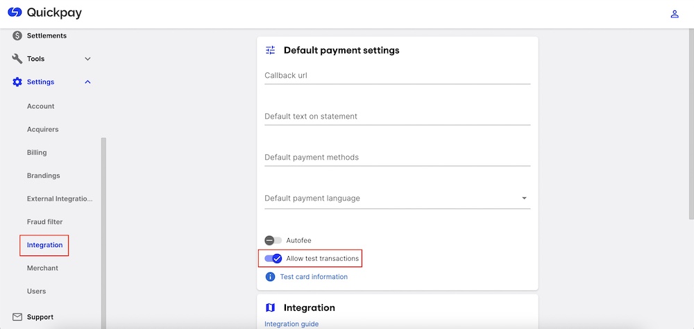 From here, enable the “Allow test transactions” option. You can now perform transactions in a test environment.
