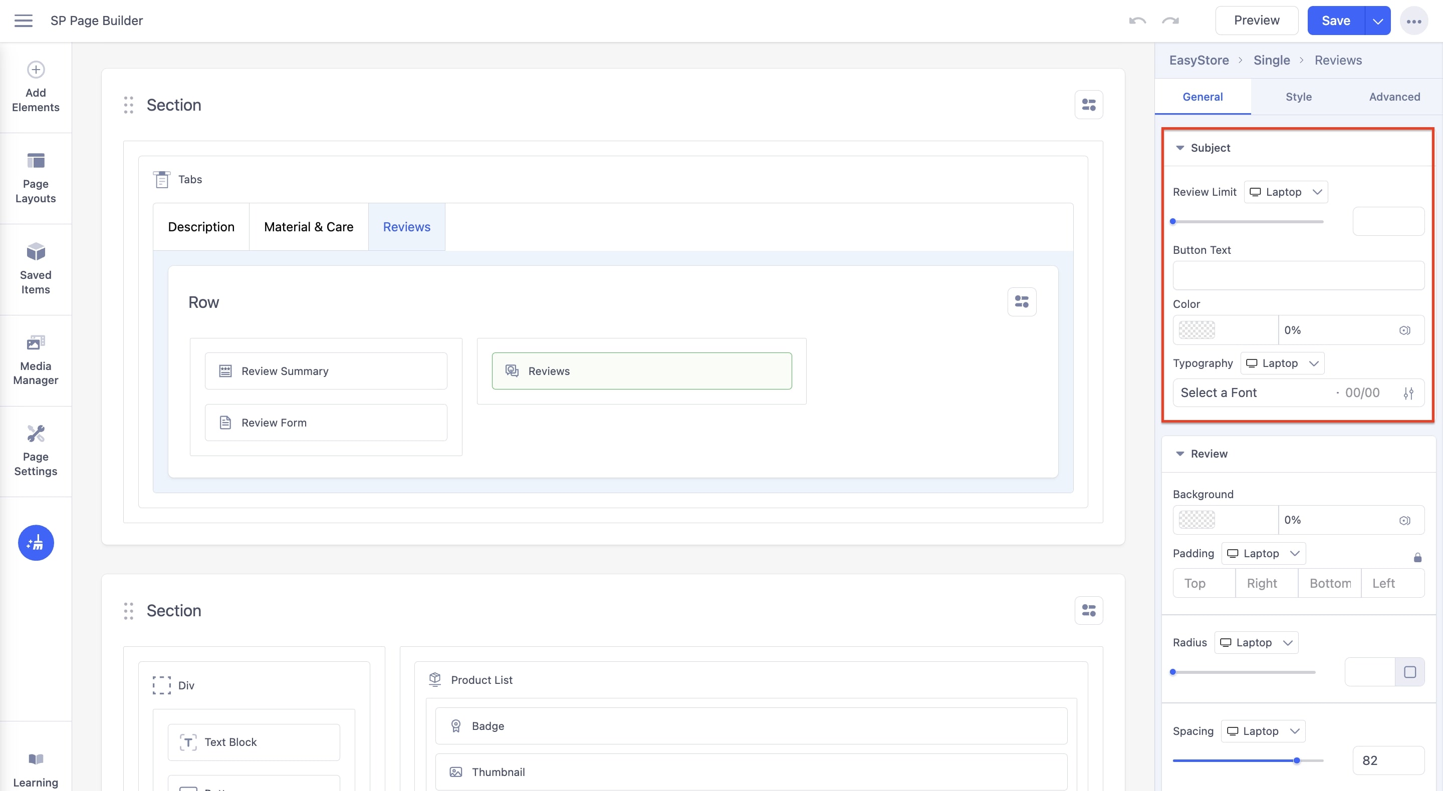 The Reviews addon for single product pages is designed to showcase customer feedback, including review text, rating stars, and the review author, in an engaging and organized layout. It offers extensive customization options, such as adjustments to typography, color, spacing, and more. This addon is essential for building trust, highlighting customer satisfaction, and helping potential buyers make confident purchasing decisions.