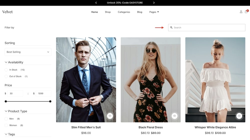 The Search addon is designed to help customers quickly find products within your store using a sleek and functional search bar on your EasyStore pages. You can customize the color, placeholder text, icon dimensions, and more to fit your store’s branding. This addon is essential for eCommerce shops, as it streamlines product discovery, enhances navigation, and improves the overall user experience.