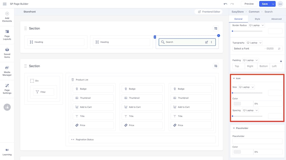 Size: You can use the slider or adjacent field to adjust the size of the search icon. You can choose the screen type, and set different dimensions for each screen type (Laptop, Tablet Landscape, Tablet Portrait, Mobile Landscape, and Mobile Portrait).