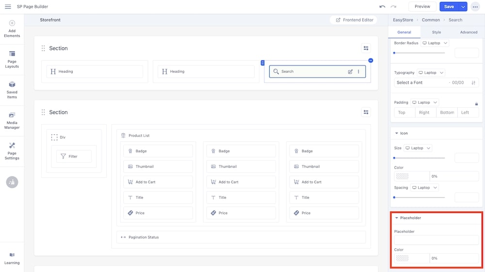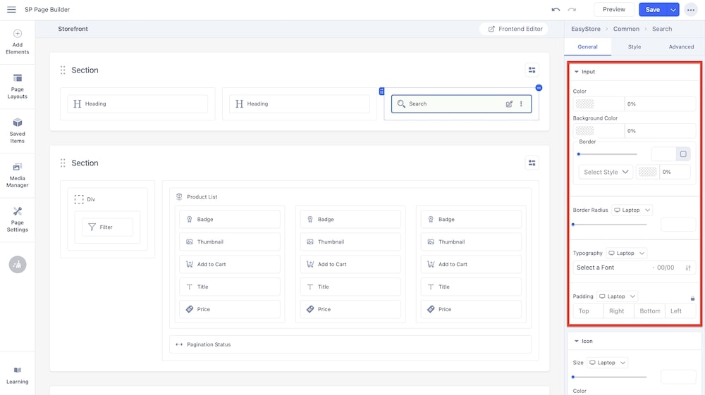 Typography: You can customize the font type, font size, Line Height, Letter Space, Style, and Weight of the text in the search bar. You can choose the screen type, and set different font settings for each screen type (Laptop, Tablet Landscape, Tablet Portrait, Mobile Landscape, and Mobile Portrait). SP Page Builder automatically adjusts the typography for responsive design by default.