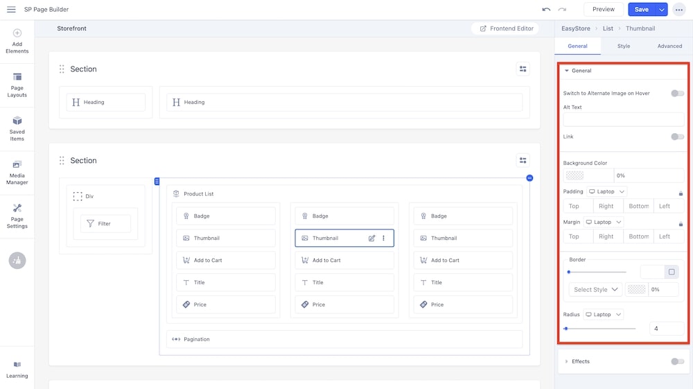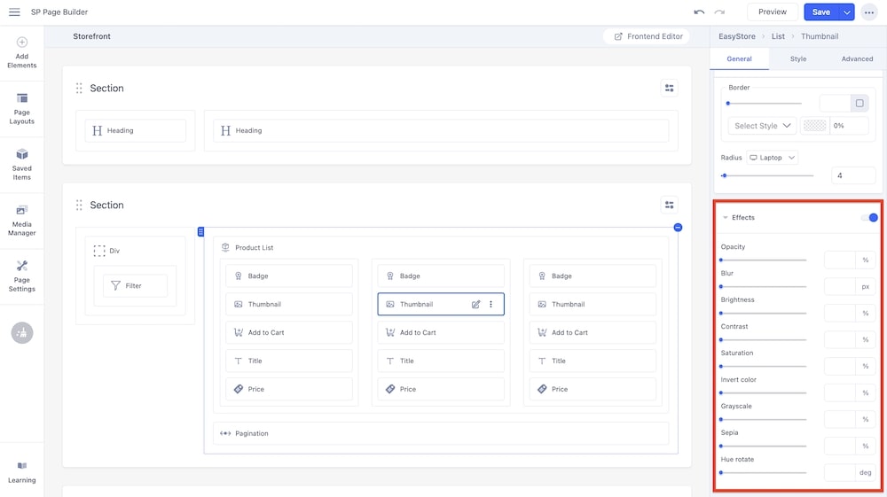 The Thumbnail addon is designed to showcase product images with precision and style in your EasyStore Storefront page. You can adjust the color, padding, margins, and border, as well as apply various effects like opacity, hue, brightness, contrast, saturation, and more. This addon enhances the visual presentation of products, captures customer attention, and creates a more engaging shopping experience.