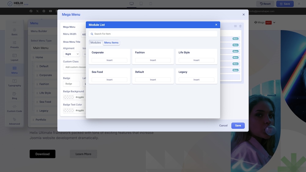 If you enabled Mega Menu and you have a row with a single column or columns, you can now add any module or menu item from the list of installed modules or available menu items. For example, you can display a banner, the latest articles, or a login module.