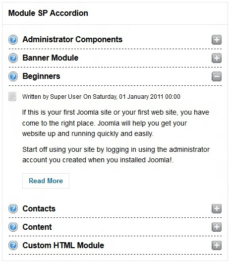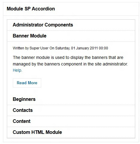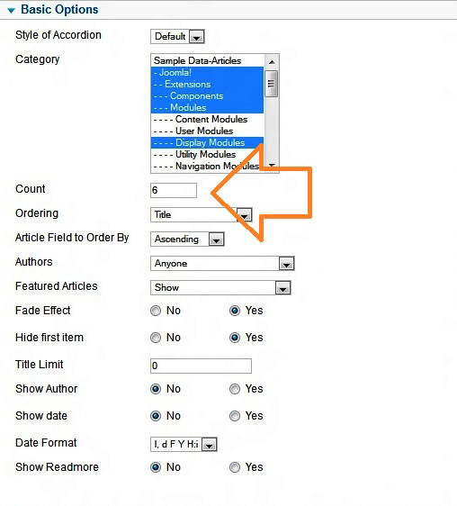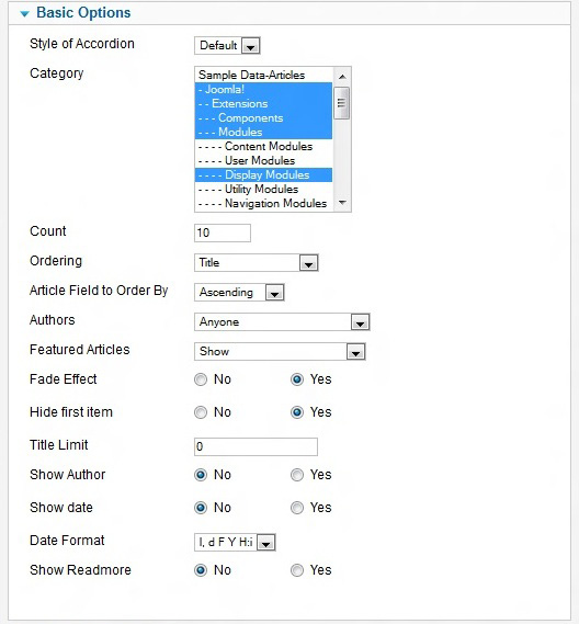 Categories[which articles will be shown is fixed up by selecting category] have to be selected.Count is the number of articles to be shown.Here we have fixed 10.There are few other options like ordering,author and date setting.Fix these settings.Style of Accordion is Default.