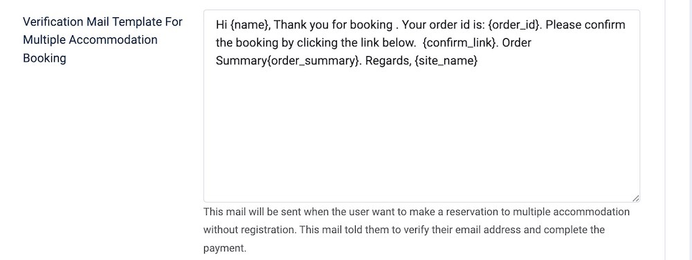 Configure automated email notifications for your guest users. This email is sent when a user wants to make a reservation for multiple accommodations without registering. It instructs them to verify their email address and complete the payment process.