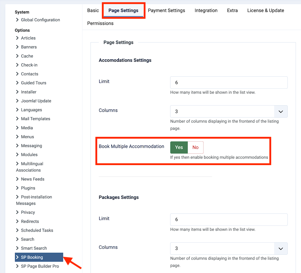 From SP Booking’s Global Configuration, navigate to the Page Settings tab and locate Book Multiple Accommodations. Activate this option to offer multiple accommodation bookings. Enabling this option will let your users select and book multiple accommodations in a single reservation transaction.