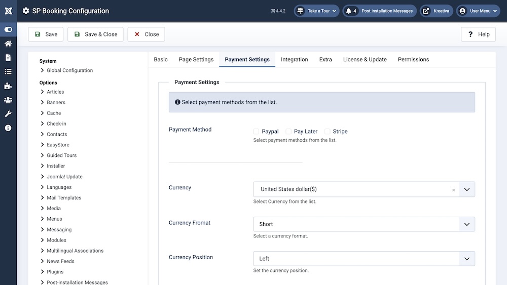 Payment Method: Select payment methods for the users. Default options include Paypal, Pay Later and Stripe.
