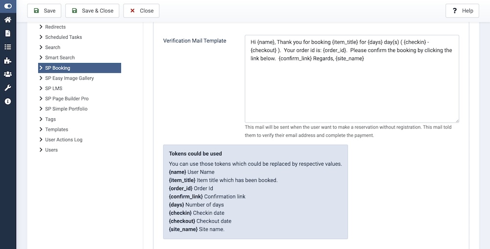 Verification Mail Template: Enter the mail that will be sent when the user want to make a reservation without registration. This mail told them to verify their email address and complete the payment.