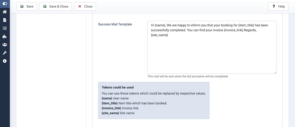 Success Mail Template: Enter the mail that will be sent when the full booking procedure is completed.
