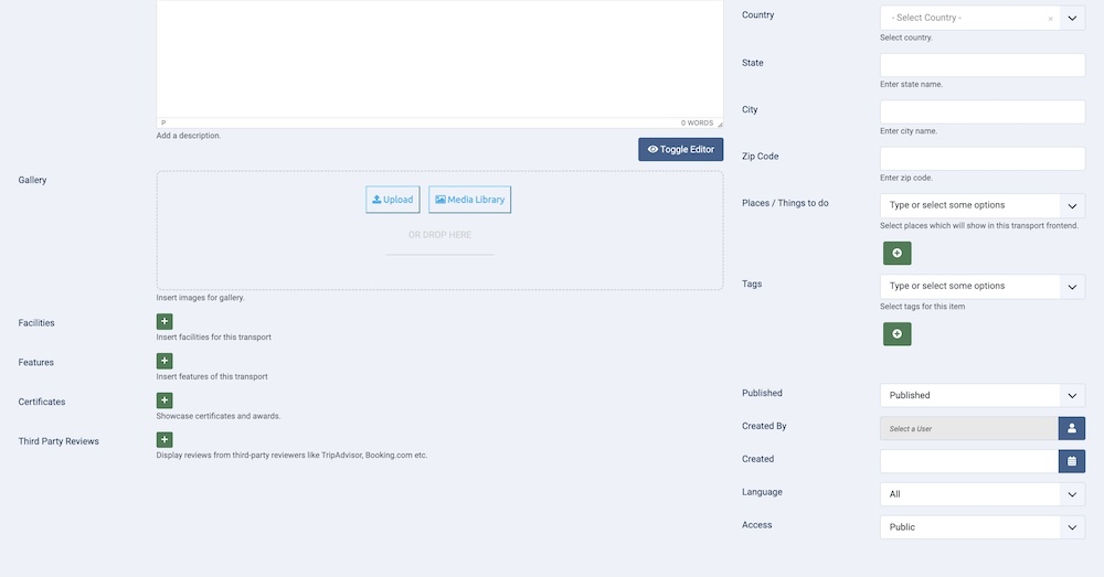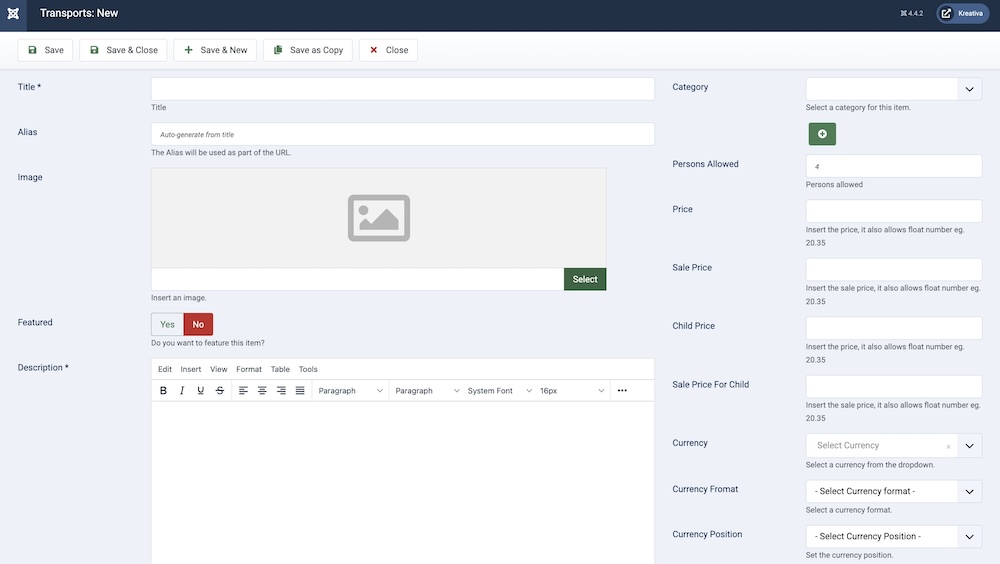 Creating a package plan is similar to creating categories, coupons, or rooms. You need to browse to Components > SP Booking > Transports > Click “+New”. Then you’ll be presented with the following screen.