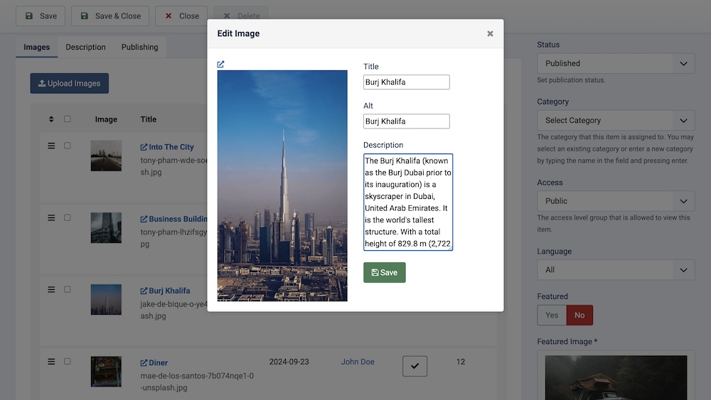 From there, click the “Edit” button located at the bottom of each image. A window will pop up where you can add or modify the image's title, alt text, and caption. Finally, click on “Save”.