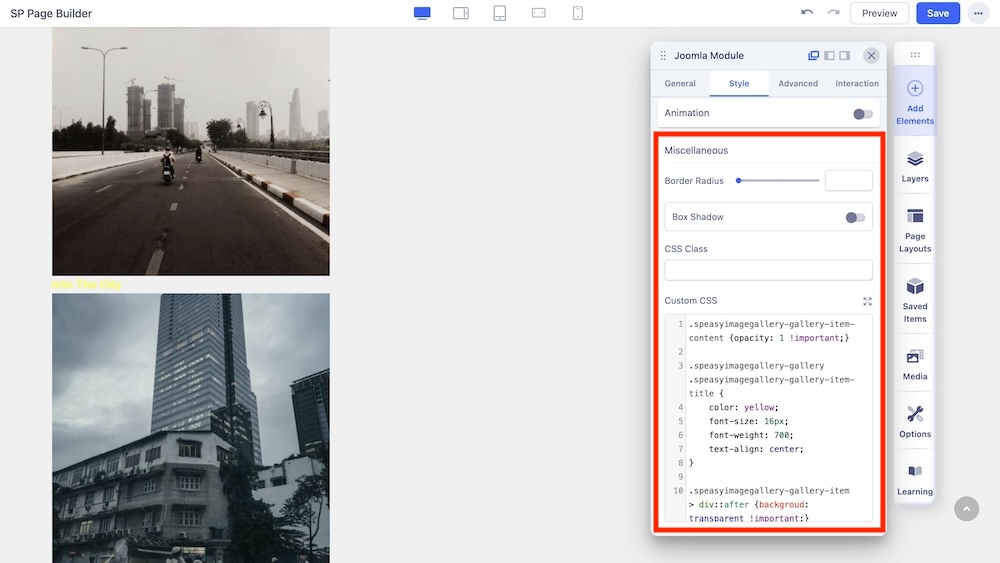 You can customize the album’s appearance by adding custom CSS. In SP Page Builder, open the editor and select the SP Easy Image Gallery Module. Navigate to the “Style” tab, scroll down, and locate the “Custom CSS” option to apply your adjustments.