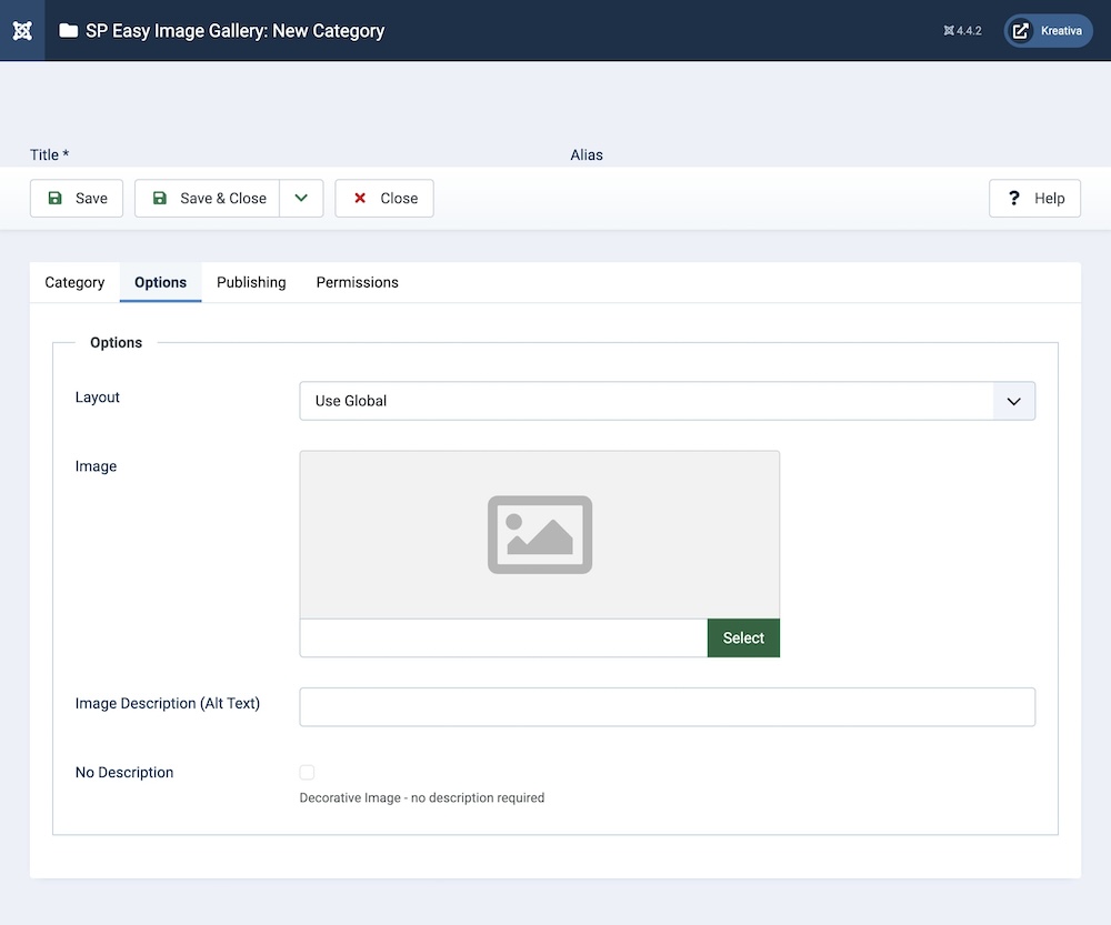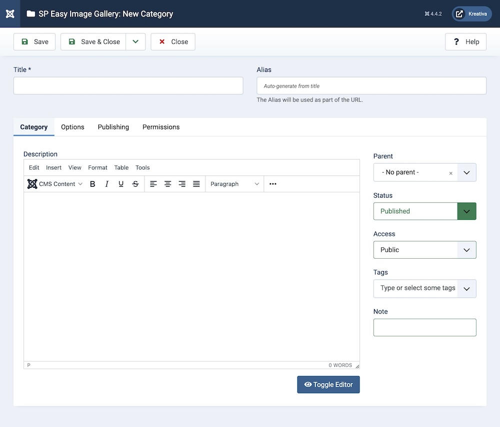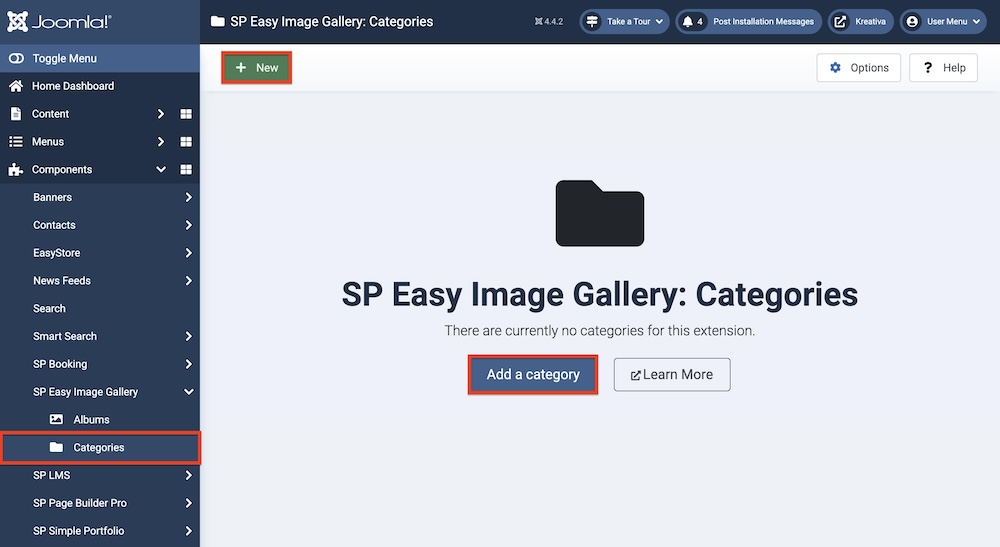 To create and add a new additional feature, go to your Joomla Dashboard > Components > SP Easy Image Gallery > Categories and click on the “+New” or the “Add a category” button.