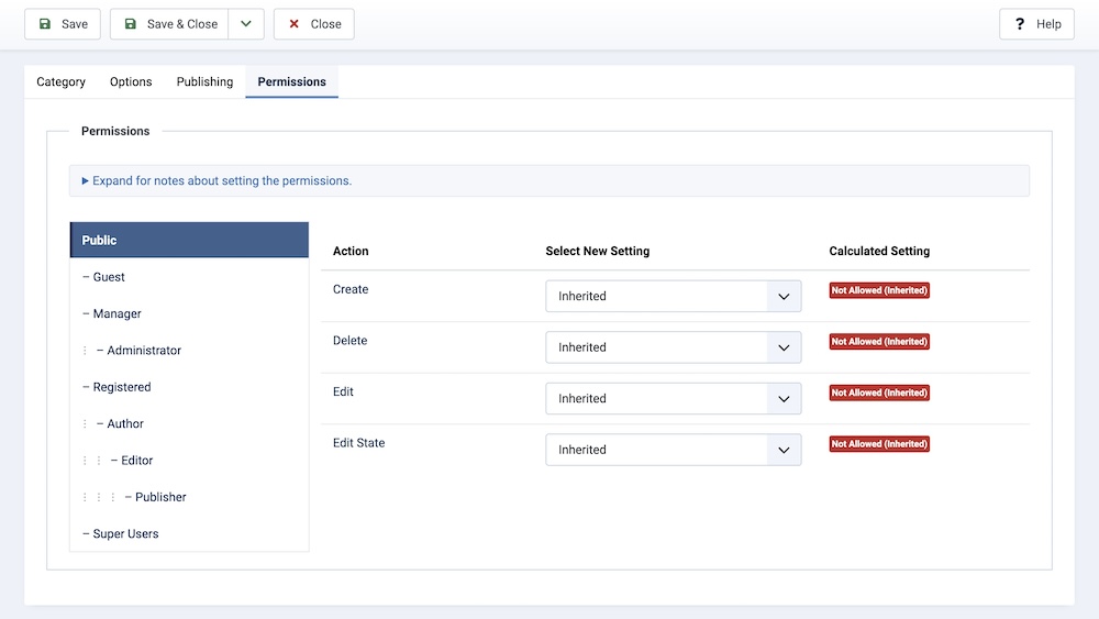 You can control the permissions for the category. This determines who can use or edit the category. You can choose between Public, Guest, Manager, Administrator, Registered, Author, Editor, Publisher, and Super Users.