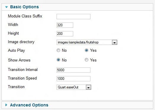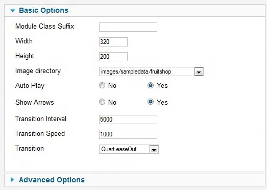 There are different options at Basic settings.Image Height and Weight have to be fixed.Image of any size will be shown at this height and width.There are Image Directory,Auto Play,Show Arrows,Transition Interval,Transition Speed and Transition option.