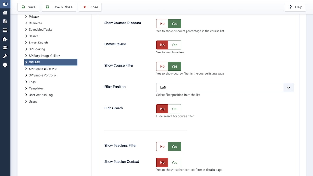 Show Teachers Filter: Toggle to show or hide the teacher filter in the course listing page.