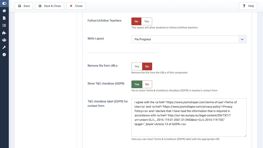 Show T&C checkbox (GDPR): Toggle this option to show or hide the Terms & Conditions checkbox (GDPR) in the teacher's contact form.