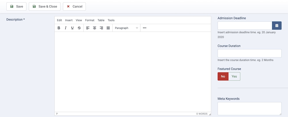 Description: This is the field where you put as much information as possible, this description will be shown on the course single page.