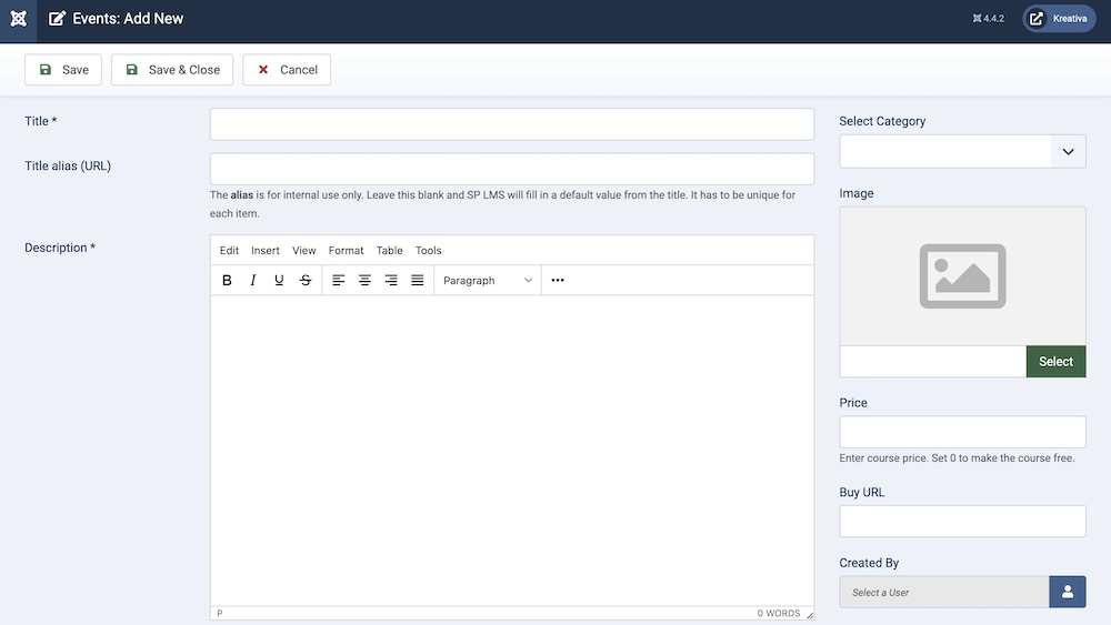 You need to browse to Components > SP LMS > Events > Click “+New”. Then you’ll be presented with the following screen.