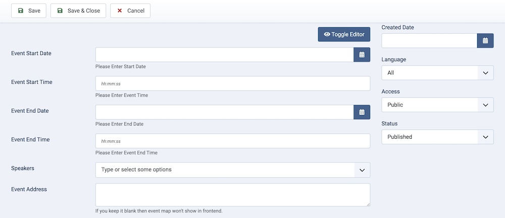 Speakers: Once you start typing the names, all the speakers you've created before will appear and you can choose the speakers of the event.