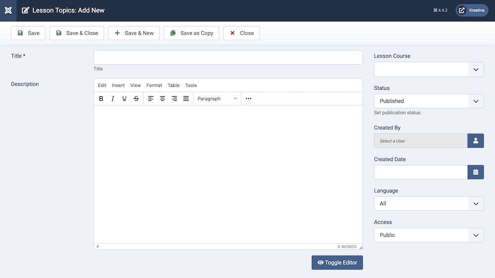 Created By: The person who creates a lesson will be automatically assigned to this field once the lesson is created, but an admin (Super User) can change the user at any time.