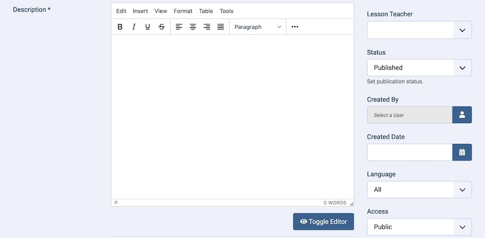 Created By: The person who creates a lesson will be automatically assigned to this field once the lesson is created, but an admin (Super User) can change the user at any time.