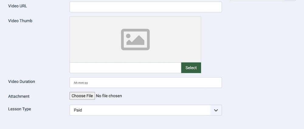 Video Thumb: You can upload a thumbnail picture for your lesson video from this option.