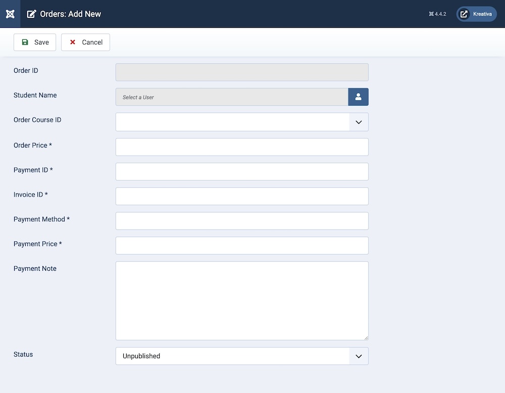You need to browse to Components > SP LMS > Orders > Click “+New”. Then you’ll be presented with the following screen.