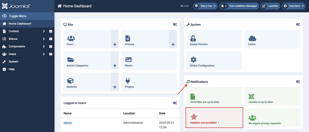 Log in to your site’s backend as an administrator and navigate to the Systems > Install > Extensions.
