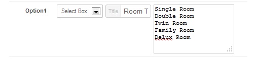 At option 1 “Select Box” have been chosen. Title is “Room Type” and Options for room choice have been declared.