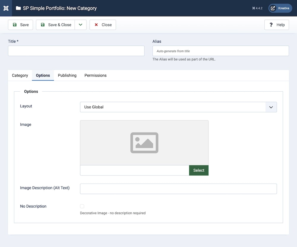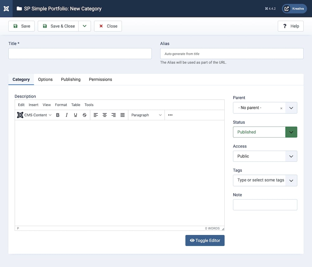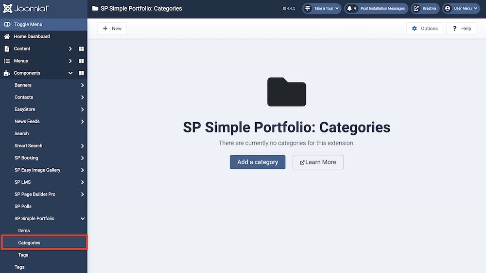 To create or edit categories, go to Joomla backend > Components > SP Simple Portfolio > Categories. To create a new item, click on “+New” or “Add a category”. You can also edit pre-existing categories by clicking on them.