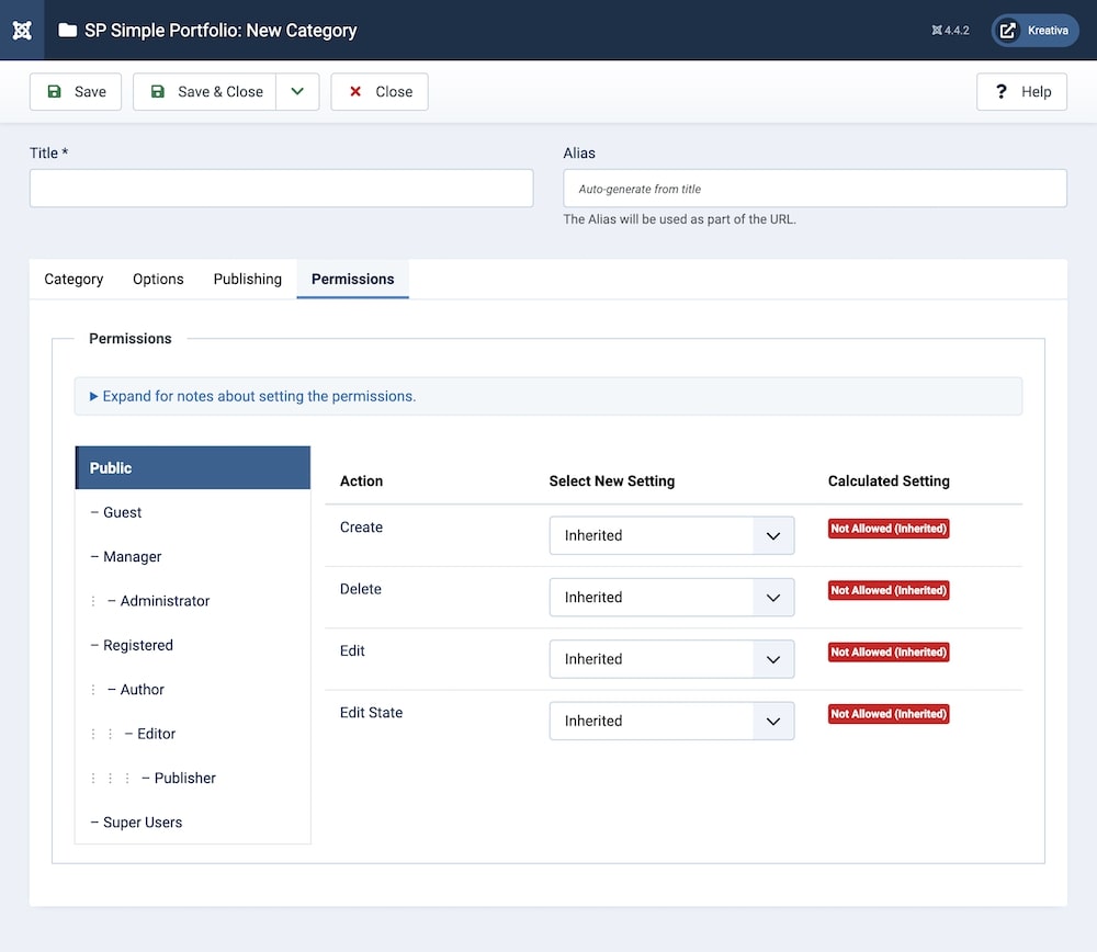You can control the permissions for the category. This determines who can use or edit the category. You can choose between Public, Guest, Manager, Administrator, Registered, Author, Editor, Publisher, and Super Users.