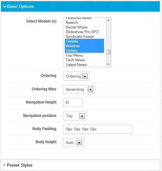 From Select Module option Modules have to be selected.Here Ordering is "Ordering",Ordering filter is "Ascending".Fix other options like Navigational height,Navigational position,Body Height etc.