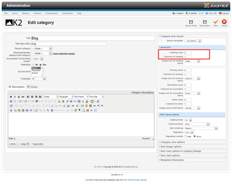 To cutomize the k2 blog we fixed two(02) leading count and one(01) columns for leading. In other layout options we select the pagination as Auto & we fixed the pagination results.